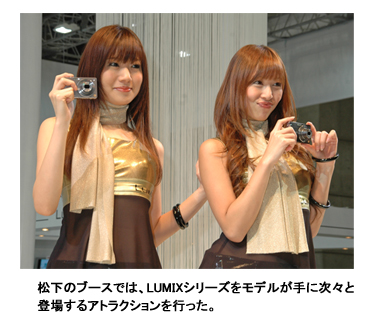 松下は、白を基調にして、竹をイメージしたメインステージを全面に展開。デジタル一眼レフからコンパクトまで、「LUMIX」シリーズを手にしたモデルが次々と登場するアトラクションを行っており、来場者の注目を集めていた。
