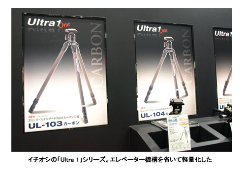 スリックの今年のイチオシは、重量1kgを切るカーボン製三脚「Ultra 1」シリーズ。従来のカーボン製三脚は、2kg前後が一般的だった。それでも、かつてのスチール製三脚に比べればはるかに軽いのだが、さらに1kgを切ることを目標に開発されたのが、「Ultra 1」シリーズだ。エレベーターをなくす代わりに、十分な全高を確保して、全体の重量軽減を実現している。ユーザーからのフィードバックをもとにエレベーターは必要ないと判断したという。