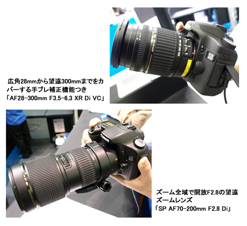 タムロンが、カウンターに実機を並べてアピールしていたのが、「AF28-300mm F3.5-6.3 XR Di VC」と「SP AF70-200mm F2.8 Di」。「AF28-300mm F3.5-6.3 XR Di VC」は、広角28mmから望遠300mmまでをカバーする超高倍率のズームレンズ。しかも、タムロン独自の光学式手ブレ補正機能(VC)を搭載する。ブースでは、振動台に乗せた同レンズで撮影したスルー画像をモニタに表示して、手ブレ補正効果を確認できるデモンストレーションを行っていた。その手ブレ補正効果は、最大でシャッター速度約4段分になるという。