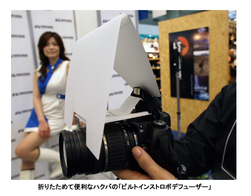 ハクバ写真産業で目立ったのは、今年1月に発売した内蔵ストロボ用デフューザーだ。デジタル一眼などのポップアップストロボに装着して利用する。カメラ内蔵のポップアップストロボを使う際に、顔が飛び気味になったり、いやな陰が出てしまったりすることがある。そんなとき、ストロボの光を拡散して、柔らかな光を作り出すのがデフューザー。しかし、ポップアップストロボに装着できるようなデフューザーはあまりなかった。
