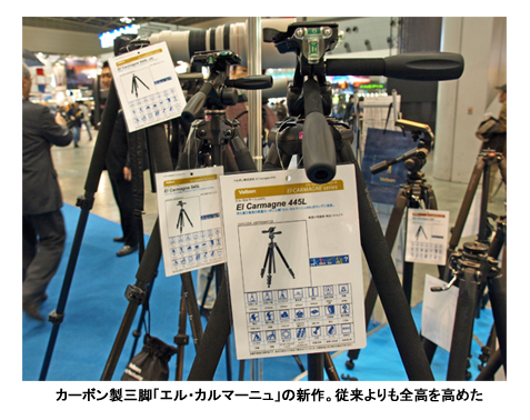 ベルボンは、カーボン製三脚「エル・カルマーニュ」の新作を展示していた。従来よりも全高を高めたのが特徴だ。雲台にカメラやデジスコを取り付けた際に、腰をかがめずに使えることを目指して開発したという。最近、バードウォッチングや野鳥の撮影が人気だが、従来の三脚ではどうしても全高が足りず、腰をかがめてレンズを覗き込むことになっていたという。その姿勢で長時間の野鳥観察はさすがにつらい。そこで、腰を伸ばしたままで使える高さの三脚が求められていたそうだ。新作の「エル・カルマーニュ」は3タイプで、いずれも目線の高さまで全高を確保した点が大きな特徴だ。