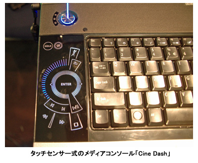 サウンド機能には、米ドルビーラボラトリーズが開発したPC向けの最新音響技術「Dolby Home Theater」を採用。内蔵のスピーカー2基とウーファー1基で、音声を5.1chサラウンドで再生する。キーボードの左側には、タッチパネル「Cine Dash」を搭載。音楽やDVD再生ソフトなどの操作が指先だけでできる。
