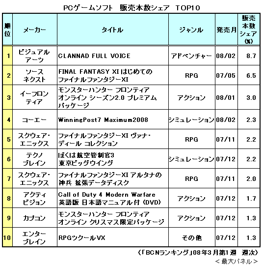 ビジュアルアーツのPCゲーム「CLANNAD(クラナド) FULL VOICE」が、3月第1週(3月3日-9日)のPCゲームランキングでトップに立った。「CLANNAD FULL VOICE」はパッケージに可愛い女の子たちが描かれた、いわゆる萌え系ゲーム。「CLANNAD FULL VOICE」を含めた最新の人気PCゲームを「BCNランキング」でチェックした。