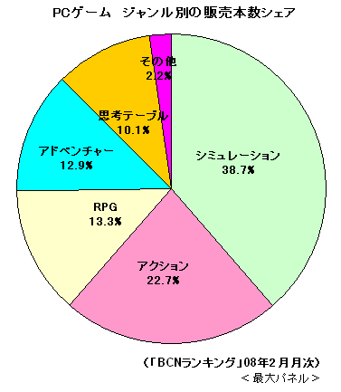 最後に、ジャンル別の販売本数シェアを見ていこう。ゲームというとRPGを思い浮かべる人が多いかもしれないが、PCゲーム市場では恋愛シミュレーションや戦略シミュレーションなどのシミュレーションゲームの人気が高い。直近の08年2月月次ではシミュレーション38.7%、アクションが22.7%、RPGが13.3%、アドベンチャーが12.9%、といった割合だ。PCゲームでは腰を落ち着けてじっくり遊ぶゲームの人気が高いといえそうだ。(BCN・山下彰子)