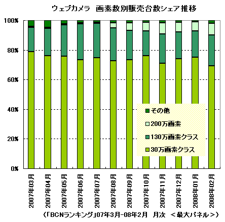 実は07年7月まで200万画素モデルをほぼ独占していたのはマイクロソフトだった。しかし、07年8月以降ロジクールがシェアを拡大、現在は約9割を占めている。2月の画素数別販売台数シェアは7.8%。販売金額シェアでは07年8月から増加し、2月には20.6%に達した。