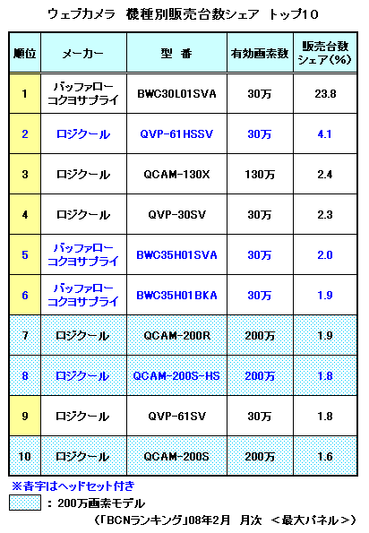 200万画素モデルは「これから」が旬のモデル。一方、台数ベースで約7割と現在市場で最も人気が高いのは30万画素クラスのお手軽モデルだ。次が130万画素クラスで約2割、といった構図だ。2月売れ筋トップ10をみると、1位はバッファローコクヨサプライの30万画素モデル「BWC30L01SVA」で、シェア23.8%。07年9月から1位をキープし、法人向けとしても人気を集めているようだ。