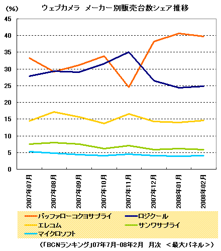 メーカーの販売台数シェア推移は、07年8月以降ロジクールとバッファローコクヨサプライの2社がトップを争っていた。しかし、07年12月にバッファローが1位を奪還し、現在約4割を占める。2位のロジクールは20%台半ば。3位以下はエレコムが15%前後、サンワサプライとマイクロソフトが一桁台で推移している状況だ。