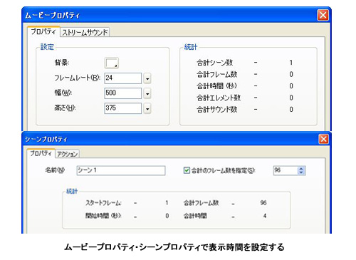 ムービープロパティで画面サイズ、シーンプロパティでFlashアニメの表示時間の設定を行おう。終わったら画面に表示する素材を配置していく。