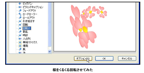 それでは作成した画像を動かしてみよう。「Web Effect」では単純な画像にエフェクトをつけるだけで、誰でもきれいで複雑なアニメーションを作成することができる。先ほど作成した桜のシーンの桜を選択し、好きなエフェクトをつけプレビューしてみる。すると桜がくるくるときれいにアニメーションを行った。