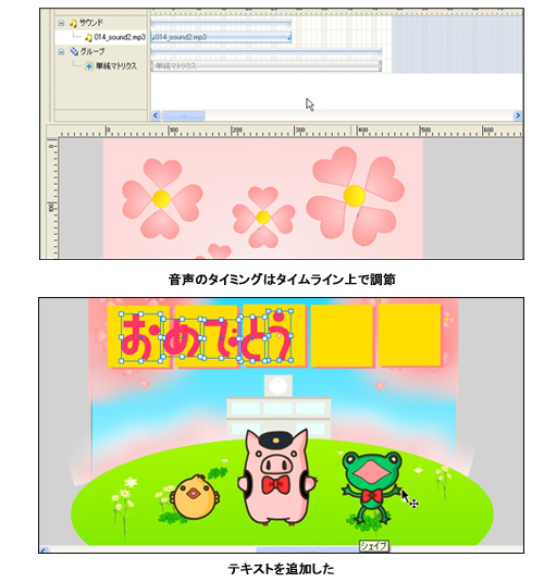 効果音として音声もつけてみた。「Web Effect」では音声素材も多く用意されている。桜が表示するシーンに音声を読み込み配置してみると、桜が出てくると同時にキラキラと音がするアニメができあがった。音声のタイミングはタイムライン上で調節できる。このあと、テキストの追加・エフェクトの設定を行い、Flashアニメの調整を行った。