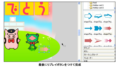 最後にこのムービーにプレイ・リプレイボタンをつけてみる。最初と最後を停止させ、矢印素材を配置する。矢印に各シーンに行くようなActionScriptをつけてあげれば完成だ。プレイボタンを押してあげると、桜の舞う入学式のFlashアニメが再生される。このソフトはActionScript2.0に対応しているので、他にも複雑なActionScriptを使うことも出来る。