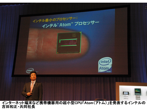 インテルは4月2日、インターネット端末など携帯機器向けの超小型CPU「Atom(アトム)」とAtomを中心にした半導体セット「Centrino Atom プロセッサー・テクノロジー」を発表した。消費電力が小さく、PC用向けWebサイトの閲覧ができるようソフトウェアの互換性にも配慮したのが特徴。夏以降、パソコンメーカーなどが搭載端末を順次発売する予定。会見で吉田和正・共同社長は「Atomで新しいインターネット体験とブロードバンドサービスを広げていきたい」と意気込みを述べた。