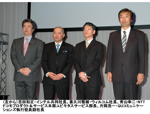 QUコミュニケーションズの片岡浩一・執行役員副社長は「当社が行うWiMaxはインテルのCPUの性能を最大限に使うことができる」と強調。ウィルコムの喜久川雅樹社長は「新型CPUを使った端末を近々に発表する。また次世代PHSの端末でも導入してく」と意気込みを述べた。