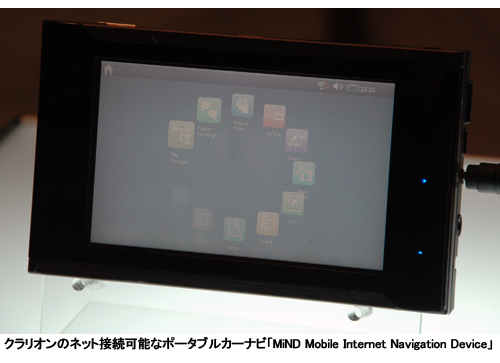 クラリオンは、インターネットに接続できるポータブル型のカーナビ「MiND Mobile Internet Navigation Device」を展示した。日本での発売は未定だが、米国では今秋にも発売する。CPUは800MHzのAtomを採用。