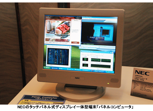 NECではタッチパネル式のディスプレイ一体型端末「パネルコンピュータ」を展示。メモリは512または1GB。記憶媒体用スロットを設けており、コンパクトフラッシュ(CF)かHDDを選ぶことができる。CFの場合は1または4GB、HDDなら80GB。OSはWindows Vista、XP。