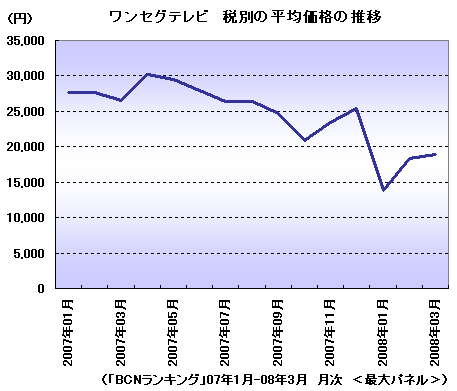 最後に税別の平均価格もチェックしよう。07年1月は2万円台後半だったが、およそ1年でゆるやかに下がり、08年3月は1万円台後半となった。これから新たにワンセグ機能付き端末を購入する場合は、他の機器と比べるとなかなか手頃な価格だ。