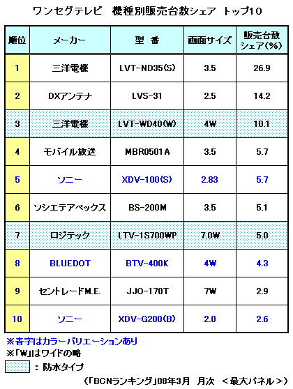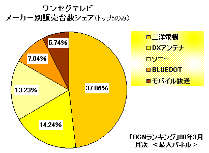 ワンセグテレビが初めて販売された07年1月以降、新規参入が相次いでいる。3月のメーカー別販売台数シェアトップ5を見ると、1位は07年夏頃に販売を開始した三洋電機で37.1%。2位で14.2%のDXアンテナも07年冬頃に加わった。そのほか、3位はソニーで13.2%、4位はBLUEDOTで7%、5位はモバイル放送で5.7%。