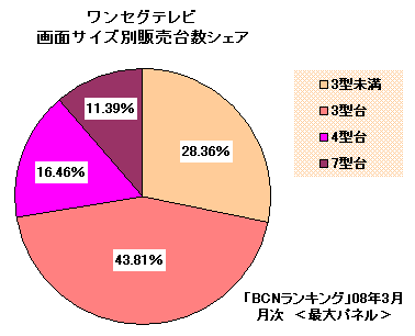 売れ筋の画面サイズは、メーカーの新規参入時期によって変動はあるが、3月の場合、1位は3型台で販売台数シェアは43.8%。次いで3型未満が28.4%、4型台が16.5%、7型台が11.4%。3型未満や3型台は小型で外出時に持ち歩くのに適している一方、7型となると結構大きく、室内の好きな場所に移動して視聴するのに便利だ。
