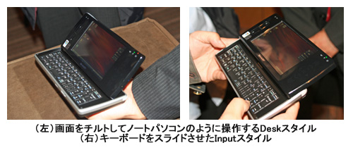 本体サイズは、高さ84×幅188-192.3×厚さ25.9mmで重さ約470g。USB2.0対応のUSB端子やmicroSD メモリカードスロットを装備。また専用クレードルには音声出力やD端子、4つのUSB端子を搭載。別売りのRGB/USBケーブルも接続できる。本体は、キーボードを閉じたViewスタイル、キーボードをスライドさせたInputスタイル、画面を斜めに立ててノートパソコンのように操作するDeskスタイルの3つのスタイルで利用できる。