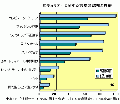 情報セキュリティに関する言葉で、最も認知度が高かったのは「コンピュータ・ウイルス」。98.7%が「聞いたことがある」と答えた。しかし正しく理解してるのは61.9%だった。また「フィッシング詐欺」についても、88.0%が認知しているのに対し、理解しているのは50.8%にとどまった。一方、「ワンクリック不正請求」については、84.9%が認知している上、理解度も66.2%と高かった。特にワンクリック不正請求では、07年3月の調査と比較して理解度がほぼ倍増した。