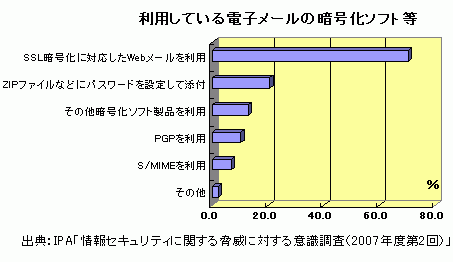 また「電子メールの暗号化ソフト等の利用」では、16.0%が実施していると答えたものの、具体的内容として「SSL暗号化に対応したWebメールを利用」が70.4%と最も多かった。SSLでの暗号化は、メールを送受信するパソコンと直接つながったサーバーの間だけで有効なもので、それ以降、相手に届くまでの経度での暗号化を保証しているものではない。「電子メールの暗号化」にはこうした誤解も多いようだ。