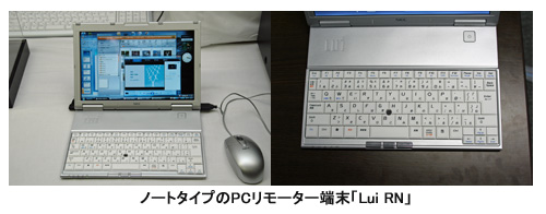 ノートタイプ「Lui RN」は、B5サイズのノートPCとほぼ同じサイズで、ディスプレイに10.6型のWXGA液晶と、ノートPCと同等のキーボードを備える。OSはWindows CE 5.0。HDDやメモリがないため、薄さ15.8mm、重さ650gの小型・軽量化を実現した。ネットワークは有線LANとIEEE802.11b/g規格の無線LANに対応する。サイズは、幅258×奥行き199×薄さ15.8mm。バッテリー駆動時間は最大4.6時間。実勢価格は9万円前後見込み。