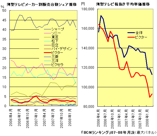3月現在の「BCNランキング」の集計では、液晶にプラズマを加えた薄型テレビ全体ではトップ4社が販売台数シェア2桁台で争っている。1位はシャープで41.2%、2位がソニーで21.4%、3位が12.6%の東芝、松下が11.6%で4位だ。一方ビクターは2.0%とふるわず、この2年ほどは5%未満の低空飛行を続けている。さらに今年に入って、低価格路線で攻めるバイデザインと6・7位争いを繰り広げており、3月では2.3%のバイデザインに破れ7位に甘んじている。