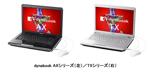「dynabook AX/TXシリーズ」は、ともに15.4型ワイド液晶を装備するほか、「AXシリーズ」では初となるharman/kardonステレオスピーカーも搭載し、臨場感のある音楽再生が可能。CPUは、「AXシリーズ」にCeleron 550(2GHz)、「TXシリーズ」にCore 2 Duo T8100(2.1GHz)を搭載する。