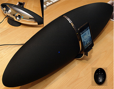 発表会でとりわけ目を引いたのが、イギリスの名門オーディオメーカーB&W(バウアーズ&ウィルキンス)社製のiPod専用スピーカー「Zeppelin(ツェッペリン)」。B&W社のオーディオシステムは、ビートルズもよく利用していたロンドンのアビーロードスタジオにも採用されているという。そんな同社のiPod専用スピーカーが日本初登場。