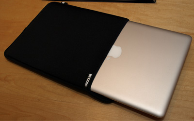 iPod関連アイテム以外にも、アップルストア先行発売の周辺機器がいくつかある。Incase Designs社製のMacBook Air専用ケース「Incase Neoprene Sleeve for MacBook Air」。外装は丈夫で軽量なネオプレーン、内装には起毛処理が施されている。ジッパーやボタン類などはなく、スリット部分からMacBook Airを出し入れする構造になっている。MacBook Airの驚異的な薄さを生かした専用ケースだ。価格は4480円。