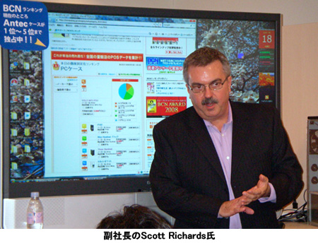 新ブランドの発表会は東京・秋葉原のAntecショールームで開催。技術担当の陳宗明氏が詳細な電源の解説を行ったほか、副社長のScott Richards氏も登場。Richards氏は、「『革新性』『デザイン』を兼ね備えたAntecにとって、日本の市場はとても重要。既に日本で評価を得ているPCケースに加え、『08年は電源の年』として、電源に注力していきたい」と方向性を語った。