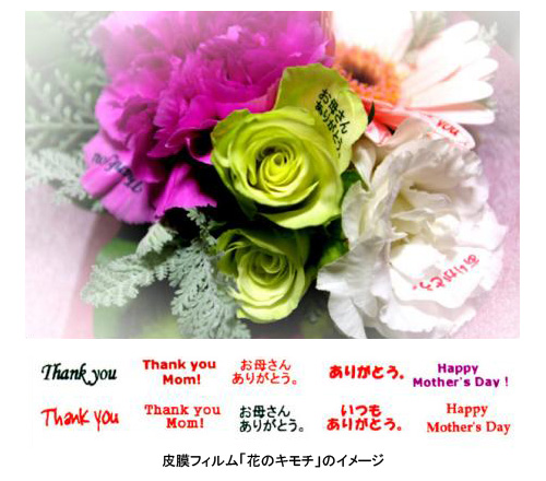 マーユは、写真やロゴ、イラストなどを花弁に直接添付できる皮膜フィルムとして、母の日向けのメッセージを印刷した「花のキモチ」を発売した。送料を含めた価格は、フィルム100枚で6000円。