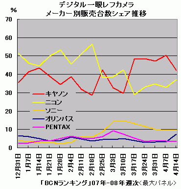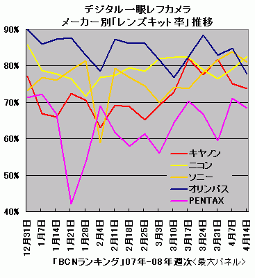 ここで注目しておきたいのがソニーとオリンパス。ソニーは、キヤノン、ニコンに次ぐ第3位の座を固めつつあるが、ここに来てレンズキット率が8割を超える水準に高まってきている。要因はα350の好調だ。このところ勢いこそ落ち着いてきたが、発売直後のピーク時で8.8%、直近でも5.6%のシェアがあり、キヤノン、ニコンの争いに割って入ろうとしている。また、ソニーに一時期は10ポイント以上も水を空けられていたオリンパスだが、E420の発売で勢いを増し、ソニーに肉薄している。もともとが、レンズキット率が高く、初心者層の購入が多いメーカーだ。