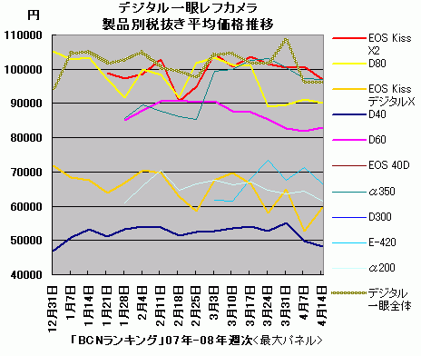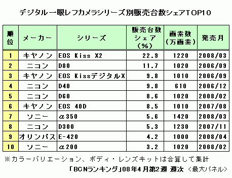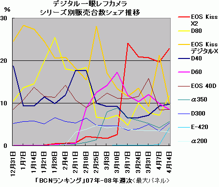 キヤノンがニコンを突き放せない要因は、ラインアップの数にありそうだ。XとX2の併売作戦を展開し、これまでの「1本足打法」からの脱却を狙っているキヤノンだが、初級-中級層で後に続くカメラがまだない。直近の4月第2週でトップ10にランクインしているモデルを見ても、キヤノンでは、X、X2の次は「40D」といきなり中・上級者向けになってしまう。一方ニコンは、初級から中級者向けで、そろそろモデルチェンジも近いのではと噂される「D80」が、値下げ攻勢で2位にランクイン。初心者向けの「D60」、入門向けの「D40」が続き、中・上級者向けD300も8位につけている。ラインアップを絞るキヤノン対ラインアップにグラデーションを持たせたニコンという状況はまだ続いているといっていいだろう。
