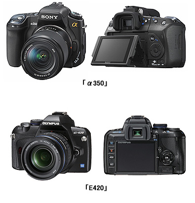 一方ソニーのα350は、ライブビュー専用のセンサーを別に設けるなどして、コンパクトデジカメに似た操作感を実現した。オートフォーカスのスピードは決して早いとはいえないが、他社のカメラと比べれば十分日常的に使えるスピードに仕上がっている。さらに、液晶画面の角度を変えることもでき、ライブビュー機能を活かしたハイアングルやローアングルでの撮影も自在だ。
