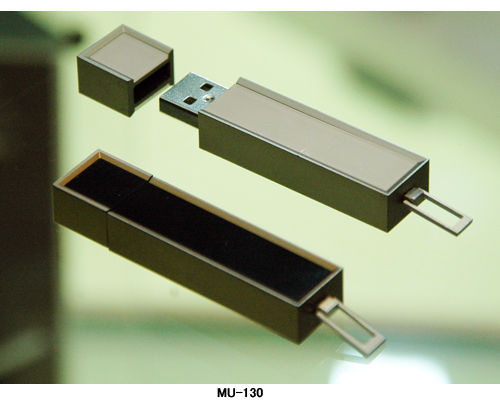 USBメモリ「MU-130」は容量が1GBで、ブラウンとホワイトを基本色で展開。本革や天然木、スワロフスキーなどを素材に使ったモデルも用意した。本体にはPCのデスクトップ上で利用できる時計やメロディーアラーム機能を搭載した。対応OSはWindows Vista/XP/2000/Me、MacOS X 10.4-5。価格は6300円で、8月に発売する。