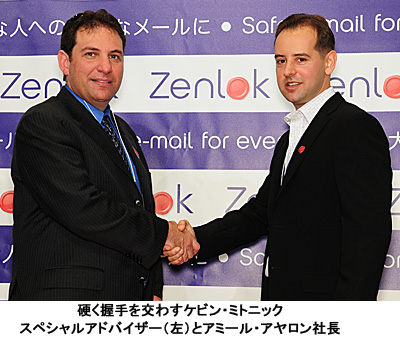 Zenlok(ゼンロック、アミール・アヤロン社長)は5月16日、簡単にEメールを暗号化できる無料のサービス「Zenlok Eメール暗号化サービス」を同日に開始したと発表した。最初の1年間で100万人の個人ユーザー獲得をめざす。東京ビッグサイトで開催中の「情報セキュリティEXPO」の同社ブースで開いた発表会見に先立ち、同社のスペシャルアドバイザー、ケビン・ミトニック氏が登場。Eメールの暗号化の必要性について特別講演を行った。