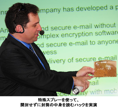 講演の最後に、特殊なスプレーを使って郵便物の中身を見るという「ハッキング」の手法も紹介。通常の封筒では開封せずに中の書類が読めてしまう様子を示した。Eメールだけでなく、郵便についてもセキュリティ対策は重要だと指摘した。
