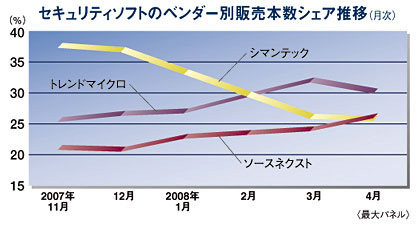 2002年、BCNランキングに「セキュリティソフト部門」が新設されて以来、年間販売本数No.1を達成してきたシマンテックだが、2007年後半からは苦しい状況が続く。シェアは下降線をたどり、4月の月次データでは3位に甘んじる結果となった。