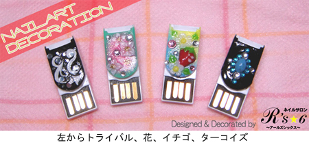 microSDカード/microSDHCカードに対応するUSB直指しタイプのカードリーダー。施されたデコレーションは、ネイルサロン「アールズシックス」のオリジナルデザインで、実際のネイルアートと同じ手順でひとつひとつプロのネイリストが仕上げた。デコレーションは「花」「イチゴ」「ターコイズ」「トライバル」の4種類。購入者にはネイルサロン「アールズシックス」で使えるネイルアート施術料20%OFFクーポン券が付く。