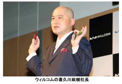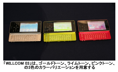 会見で喜久川政樹社長は、「WILLCOM 03」を「Advanced/W-ZERO3[es]」の後継機種と紹介。「W-ZERO3シリーズの集大成として位置付けている。商品設計をゼロから見直して、いままでのビジネスパーソンを意識したデザインから、幅広い層に受け入れられるようなカラーリングやデザインに変更した」と製品の特徴について説明した。