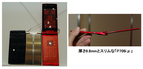 「P706iμ」は、側面ボタンを押すだけで本体が開く「ワンプッシュオープン」対応端末として世界最薄の厚さ9.8mmのスリムボディが特徴。本体にはステンレス素材を採用し、耐久性にも配慮した。半田氏は「世界最薄レベルの携帯にワンセグを入れ、従来は実現しにくかった薄さとワンセグ機能を両立できた」と、製品の出来に自信を見せた。本体サイズは幅50×高さ109×厚さ9.8mm。カラーはRED、BLUE BLACK、CHAMPAGNEの3色。