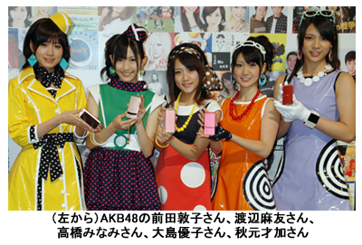 また、今回の新製品発売に合わせ開始する動画サービス「ドコモ動画」では、14ジャンル、100番組の視聴が可能な「Music&Videoチャンネル」や「iアプリムービー」に対応するほか、ビデオクリップのダウンロードも可能。対応する端末はすべての「906iシリーズ」と、「706iシリーズ」の一部。発表会には人気アイドル「AKB48」のメンバー5人が訪れ、新曲のPVなどを「ドコモ動画」向けに独占配信することを明らかにした。