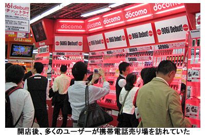 開店前の早い時間に関わらず、記念イベントには多くのユーザーが詰めかけた。開店後は新製品が目当てのユーザーで、携帯電話売り場は賑わい、順調な滑り出しがうかがえた。