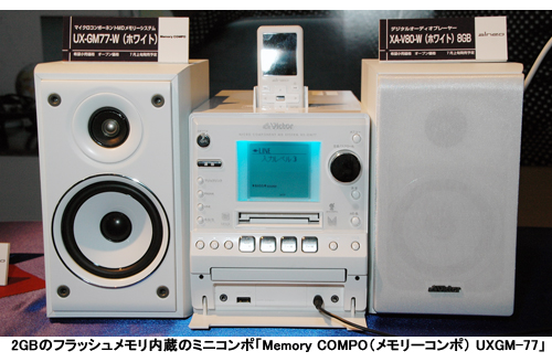 ディスプレイは27色から好みにバックライトの色を変えることが可能で、漢字の表示も行える。サイズは本体が幅165×高さ200×奥行き299mm。スピーカーは2ウェイバスレフ型で11cmのウーハー、4cmのツイーターを搭載。サイズは幅140×高さ241×奥行き204mm。カラーはブラックとホワイト。ビクターでは音質にこだわる3-40代の人をターゲットに販売する。