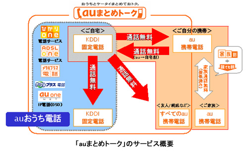 対象となる固定サービスは「メタルプラス電話」、光ファイバーを使った電話サービス「ひかりone電話サービス」、CATVを利用した電話サービス「ケーブルプラス電話」、ADSLと同時利用する電話サービス「ADSL one電話サービス」、インターネット接続サービス「au one net」で提供するIP電話サービス。また、今後は固定電話サービスを「auおうち電話」の総称でまとめ消費者にわかりやすいサービスとして展開する。