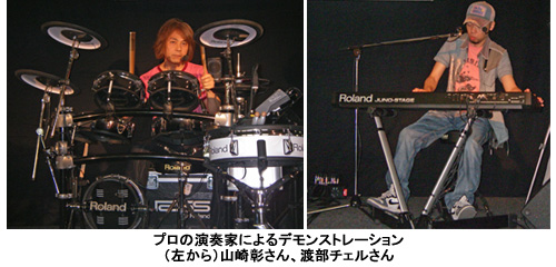 このほか、発表会の会場では、プロの演奏家によるデモンストレーションも実施した。パーカッションとドラムは山崎彰さん、シンセサイザーは渡部チェルさんが担当。各機器の使いやすい点を実演を交えて詳しく紹介した。