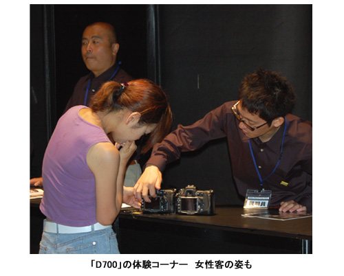 会場の両サイドには体験コーナーを設け、新製品の「D700」をはじめ「D3」「D300」などの上位モデルも含め10台以上展示。スタッフも10名ほど配置し、来場者が自由に触れる環境で使い方、新機能などの説明を行った。
