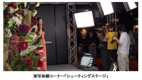 また、実際に撮影ができる「シューティングステージ」も設置。被写体に女性モデルと色とりどりの花を用意し、参加者はそれぞれ「D700」での撮影を楽しんだ。その隣には撮影データをすぐに出力できるようプリントコーナーも併設し、撮影結果の出力サービスも行った。CFカードを持参した来場者は、「D700」の撮影データを持ち帰ることもできた。