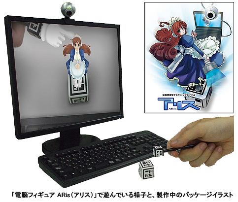 現実環境にコンピュータで情報を付加して表示する拡張現実技術(AR=Augmented Reality)を使った世界初の商用エンタメソフトウェア。「電脳キューブ」と呼ばれるサイコロ状の立方体を机の上に置き、Webカメラで撮ると、PCの画面上ではキューブの上に女の子のフィギュア登場。机の上を動き回る、というもの。